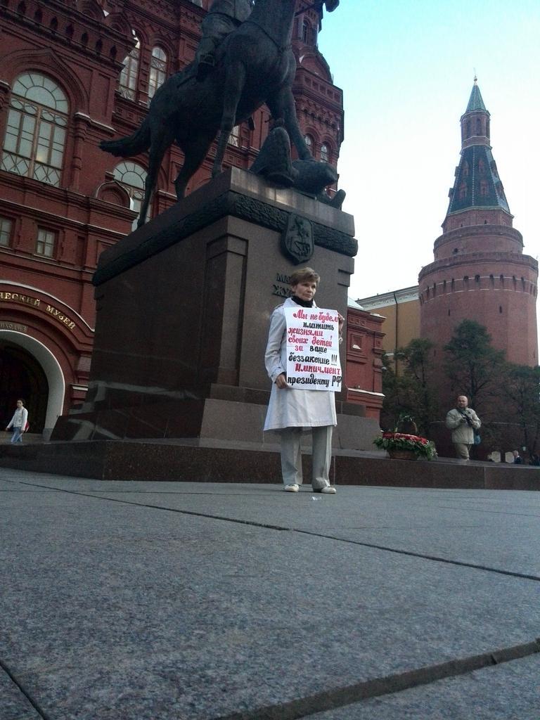 По словам журналистов, которые стали свидетелями акции, для задержания активиста, который стоял в центре Москвы без плакатов и другой символики, понадобилось четверо полицейских.